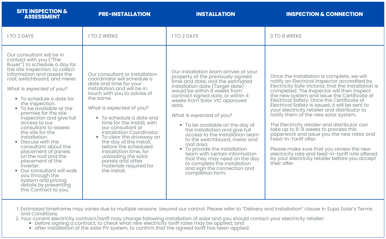 8.1 The Seller will provide the Buyer with the system specified in the quote, and will arrange for installation of the system by a Clean Energy Council (CEC) accredited installer, on a date that is agreed to between us.